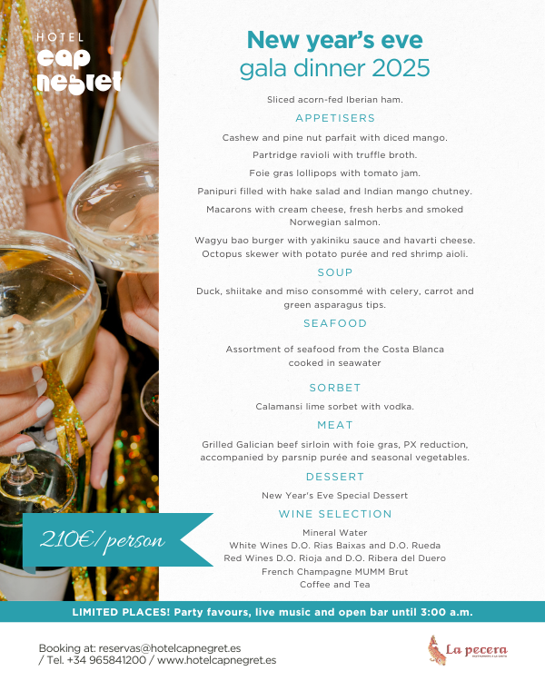 Célébrez le réveillon du Nouvel An au Cap Negret, à Altea. Cette année, profitez d'une nuit inoubliable avec un dîner de réveillon, des cotillons et de la musique en direct.